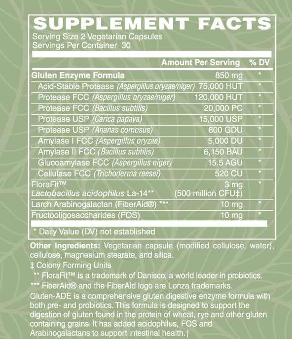 Description: Gluten-Ade is a comprehensive digestive enzyme formula designed to support the digestion of gluten. It includes a blend of enzymes and probiotics to enhance nutrient absorption and promote intestinal health. Research indicates that enzymes such as acidophilus, FOS, and arabinogalactans can support digestive function and alleviate discomfort associated with gluten intolerance. This supplement is suitable for individuals seeking to manage gluten sensitivity or improve overall digestive health.