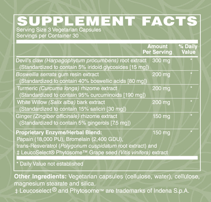 Description: InflamMove is formulated to support healthy joint and mobility with a blend of devil’s claw, boswellia, turmeric, white willow, and ginger extracts. Studies indicate that these natural ingredients have anti-inflammatory and pain-relieving properties that can help reduce joint pain and improve mobility. Boswellia and turmeric are particularly effective in reducing inflammation, while devil’s claw and white willow provide analgesic effects. This supplement is ideal for those looking to manage inflammation and maintain joint health.